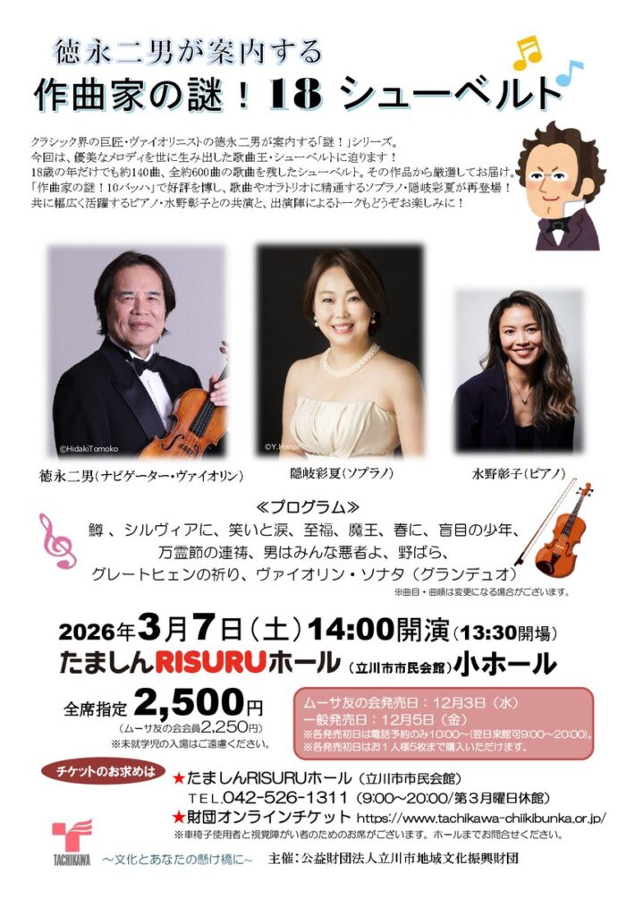 出演 徳永二男(ナビゲーター・ヴァイオリン) 隠岐彩夏(ソプラノ) 水野彰子(ピアノ)